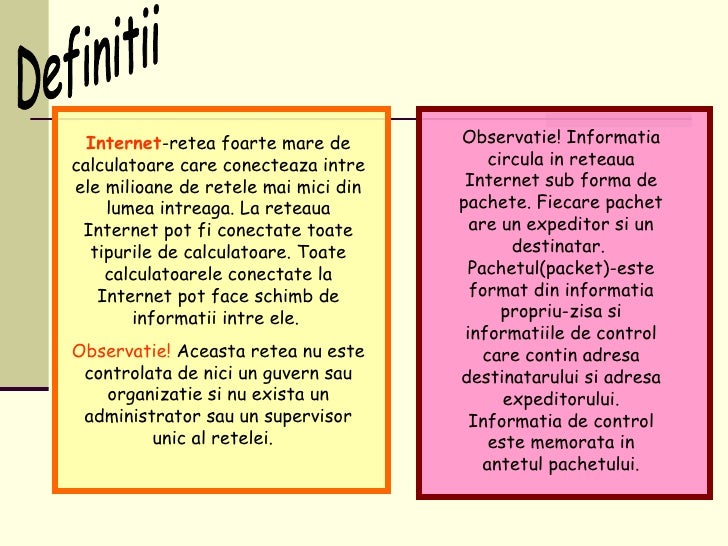 ScooBy^ 16 Posted October 20, 2014 Share Posted October 20, 2014 1. Istoria Internetului Definitii Adresa de Internet Mod de comunicare Conectarea Servicii oferite Functia de documentare Functia de comunicare Reteaua Internet 2. Istoria internetului Internetul s-a nascut la mijlocul anilor 60 in forma ARPAnet- o retea intre mai multe computere din unele institutii americane, ce lucrau pentru ARPA, un departament de cercetare din cadrul Pentagonului. Interne-tul "civil" a inceput ca o retea de 4 calculatoare intre Universitatile din Utah, Santa Barbara si Los Angeles si Institutul de Cercetare din Stanford. La sfarsitul anilor 60, si inceputul anilor 70, cand Internetul numara in jur de 50 de computere, s-au dezvoltat primele dintre servicii, folosite inca si azi pentru transferul informatiei. 3. Definitii Internet -retea foarte mare de calculatoare care conecteaza intre ele milioane de retele mai mici din lumea intreaga. La reteaua Internet pot fi conectate toate tipurile de calculatoare. Toate calculatoarele conectate la Internet pot face schimb de informatii intre ele. Observatie! Aceasta retea nu este controlata de nici un guvern sau organizatie si nu exista un administrator sau un supervisor unic al retelei. Observatie! Informatia circula in reteaua Internet sub forma de pachete. Fiecare pachet are un expeditor si un destinatar. Pachetul(packet)- este format din informatia propriu-zisa si informatiile de control care contin adresa destinatarului si adresa expeditorului. Informatia de control este memorata in antetul pachetului. 4. Protocolul de comunicare- reprezinta un set de reguli prin care se asigura schimbul de date si de mesaje intre doua calculatoare intre care s-a stabilit o legatura fizica. El stabileste un limbaj comun de dialog si o disciplina a conversatiei. Protocol TCP - Transmission Control Protocol - imparte mesajul in unitati de date, numeroteaza pachetele unui mesaj si reface mesajul, la destinatie, din pachete. 5. Comutarea de pachete(packet switching) - este cea mai raspandita tehnica folosita in transmiterea datelor in retele de arie larga. Ea se bazeaza pe separarea calculatoarelor dupa functii: calculatoare cu functii de aplicatie si calculatoare cu functii de comunicatii. Internet Protocol - retelele care formeaza Internetul pot folosi fiecare in parte un anumit protocol de comunicare intre propriile calculatoare, dar intre ele retelele nu pot folosi decat un singur protocol. Acest protocol se numeste Internet Protocol (IP) 6. Adresa de internet Pentru a fi identificate, calculatoarelor conectate la Internet li se atribuie numere unice numite adrese de Internet . Deoarece utilizatorul retine mai greu un numar, calculatorului conectat la Internet i se mai atribuie si un nume cunoscut ca nume de domeniu . Domeniul poate contine mai multe subdomenii. Schema folosita de Internet pentru structurarea domeniului pe mai multe niveluri de subdomenii formeaza sistemul numelor de domeniu (Domain Name System DNS). Numele de domeniu este format din mai multe parti care corespund numelor de subdomenii. Acestea sunt separate prin punct. De exemplu: zz.alfa.beta.ro ` Numele calculatorului Grupul care gestioneaza calculatorul Zona geografica sau tara Tipul organizatiei Organizatia utilizatorului 7. Grupul care gestioneaza calculatorul (exemplu: alfa) reprezinta un grup de utilizatori sau un departament care foloseste calculatorul. Organizatia utilizatorului (exemplu:beta) reprezinta organizatia din care face parte grupul de utilizatori sau departamentul. Zona geografica sau tara (exemplu:ro) este identificata printr-un cod. Daca in numele de domeniu nu apare acest cod inseamna ca acel calculator se gaseste in SUA. Tipul organizatiei (exemplu:edu) se refera la organizatiile care fac parte din acelasi sistem. Observatie! Pentru identificare in reteaua internet, calculatoarele folosesc numere, iar oamenii – nume. Pentru translatarea numelor in numere se folosesc servere de nume. Ele sunt calculatoare dintr-un anumit domeniu (tipul organizatiei,organizatia etc.) 8. Calculatoarele client: sunt calculatoarele care au acces la informatie si o folosesc. Ele solicita un serviciu, adica emit o cerere de serviciu catre un server si asteapta raspunsul. Pe aceste calculatoare trebuie instalat un software care sa asigure accesul la un anumit tip de serviciu in retea. MODUL DE COMUNICARE Pentru furnizarea serviciilor pe Internet se foloseste modelul client-server : Calculatoarele server :sunt calculatoarele pe care se depoziteaza informatia. Ele furnizeaza un serviciu, adica primesc o cerere de serviciu, executa serviciul si transmit rezultatul catre calculatorul solicitant. Este necesara instalarea unui software pentru a asigura accesul la un anumit tip de retea. 9. Programe client: programe care contacteaza un serviciu. Persoanele care doresc sa foloseasca un serviciu al retelei Internet lanseaza in executie un program client. Clientul foloseste reteaua Internet pentru o comunicare cu serverul. Pentru unele categorii de servicii, clientul interactioneaza cu serverul si asteapta raspunsul. Pentru o alta categorie de servicii, clientul se angajeaza intr-o interactiune pe timp lung. Clientul stabileste comunicarea cu serverul si apoi afiseaza continuu datelor primite, in timp ce el transmite catre server apasari de taste sau actionari cu mouse-ul ale unor obiecte de interfata. Programe server : sunt programe care ofera servicii. Calculatoarele care ofera un serviciu lanseaza automat in executie, atunci cand este pornit, una sau mai multe copii ale programului server. Programul server ramane in executie atata timp cat nu este intrerupta alimentarea cu energie electrica. Cat timp calculatorul server nu functioneza, orice program client care vrea sa stabileasca o legatura pentru comunicare cu programul server va primi un mesaj de eroare. Din aceasta cauza, calculatorul pe care ruleaza programul server trebuie sa aiba o putere mare de calcul pentru a permite rularea simultana, cu viteza mare, a